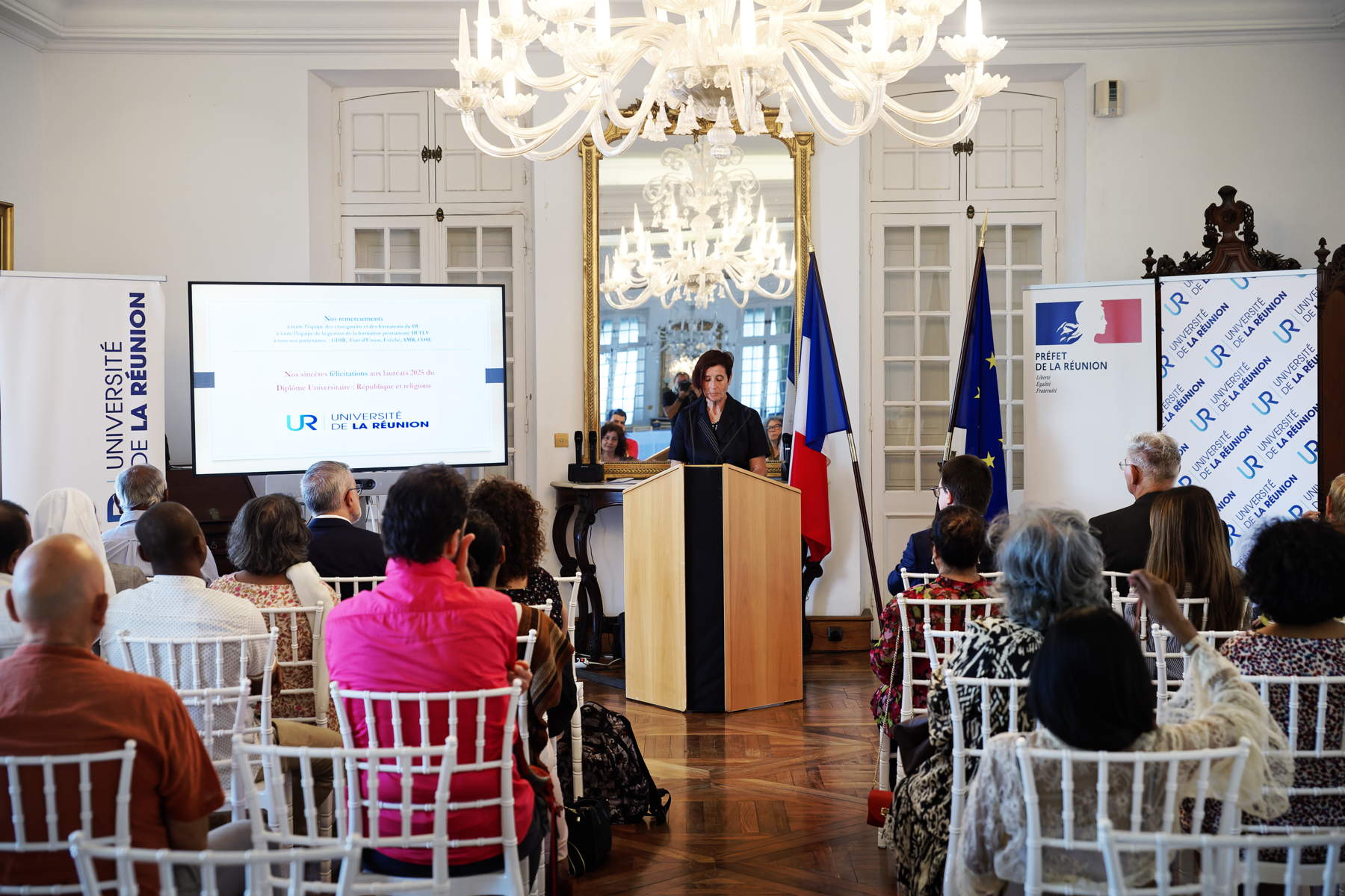 L’Université de La Réunion a organisé, ce mardi 14 octobre à 14h30, la cérémonie de remise des diplômes du Diplôme Universitaire (DU) République et Religions. L’événement s’est tenu dans les salons de la Préfecture de La Réunion, au Barachois, en présence de représentants institutionnels, de responsables religieux, de membres du Groupe de dialogue interreligieux et des diplômés entourés de leurs proches.